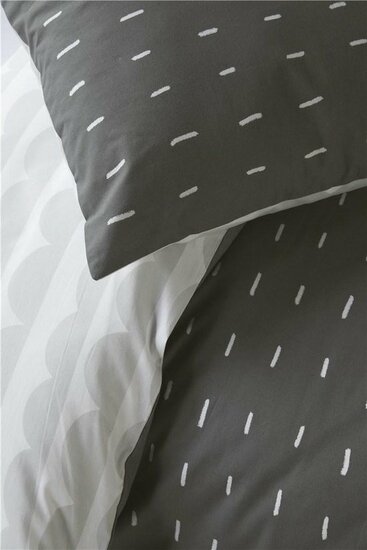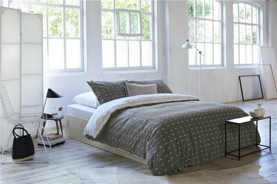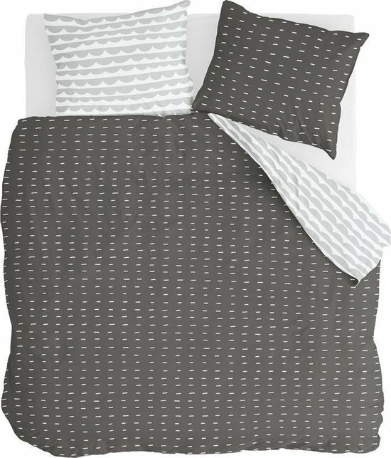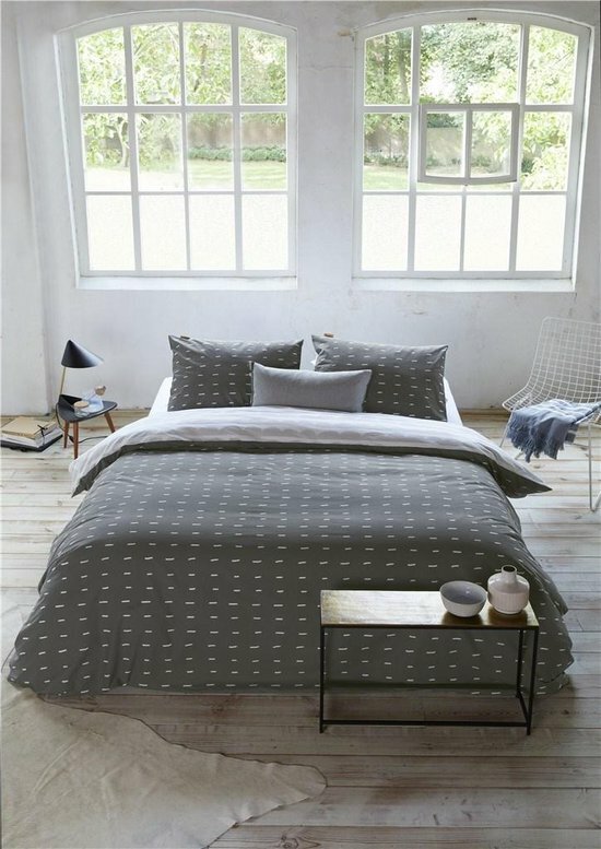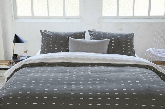 In een lichte slaapkamer breng je met gemak sfeer aan met een dit speelse dekbedovertrek. Het dekbedovertrek heeft aan de voorzijde lichtgrijze streepjes op een donkere ondergrond en aan de achterzijde lichtgrijze golfjes. Dat maakt het stoer en speels tegelijk.